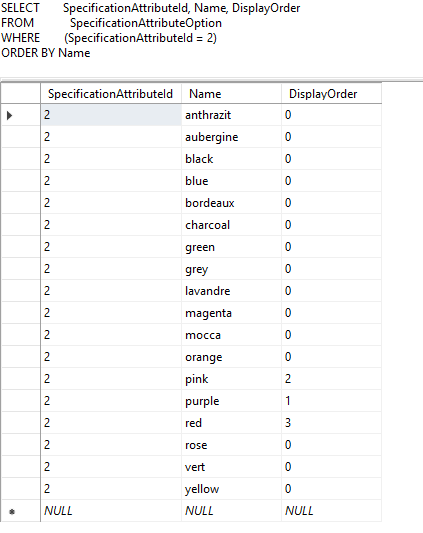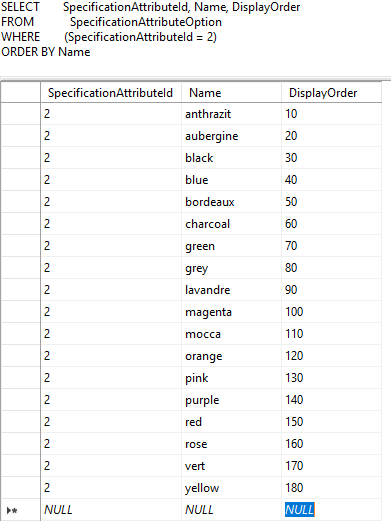 SELECT SpecificationAttributeId, Name, DisplayOrder FROM SpecificationAttributeOption