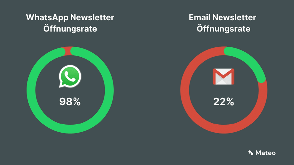 Während E-Mail-Newsletter oft ungelesen bleiben (durchschnittliche Öffnungsrate: 22 %), werden WhatsApp-Nachrichten in 98 % der Fälle geöffnet (Quelle: hellomateo.de).
