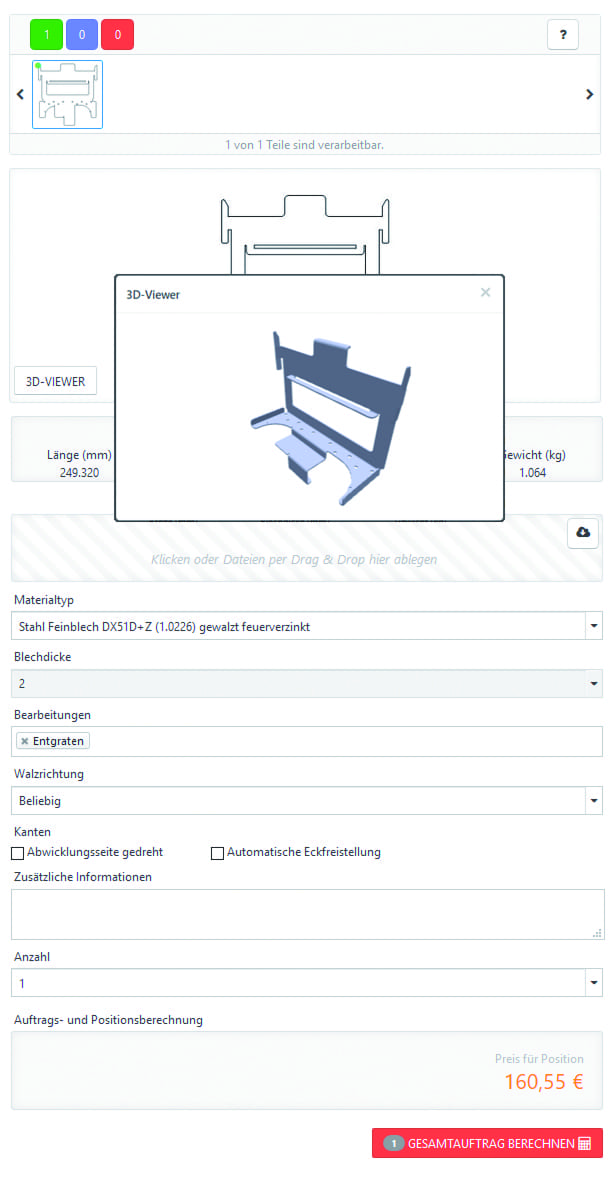 Der Anwender, z.B. ein Kundenbetreuer, lädt das zu kalkulierende Blechteil als DXF- oder STEP Datei in den Konfigurator. Anschließend definiert er Materialart und Blechdicke. Im Falle einer STEP-Datei ist die Materialstärke bereits in der Datei enthalten. STEP-Dateien erlauben darüber hinaus eine Anzeige in einem integrierten 3D Viewer. Im Idealfall erkennt das System während des Plausibilitäts-Checks die Daten als "fehlerfrei". Anderenfalls werden entsprechende Warnmeldungen ausgegeben, die Daten müssen dann ggf. modifiziert werden.