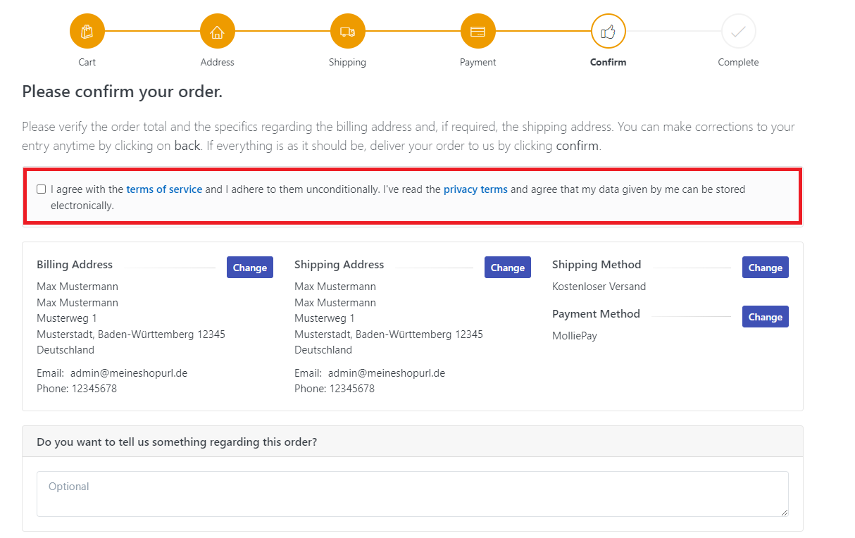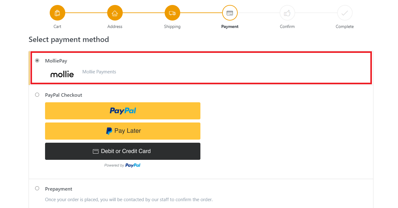 Fügen Sie ein beliebiges Produkt aus Ihrem Geschäft in den Warenkorb und simulieren Sie einen Kauf, indem Sie zur Kasse gehen. Wählen Sie unter dem Schritt Zahlung die Zahlungsmethode MolliePay aus.