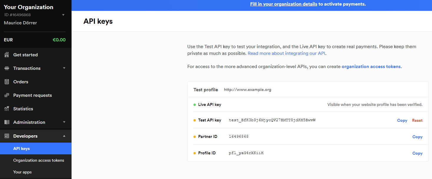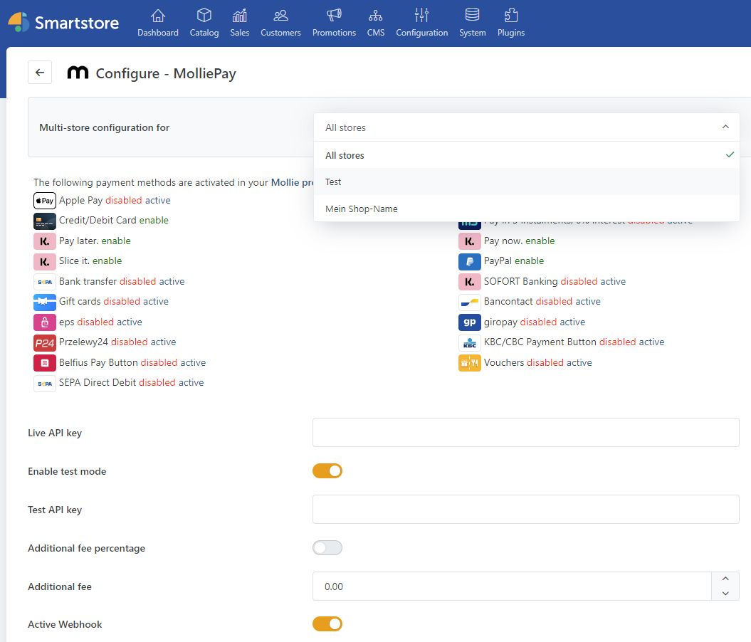 Unter Konfigurieren kann der individuelle Live-API-Schlüssel eingegeben werden. Um darauf zuzugreifen, müssen Ladenbetreiber sich unter https://my.mollie.com/dashboard/login?Lang=en einloggen.