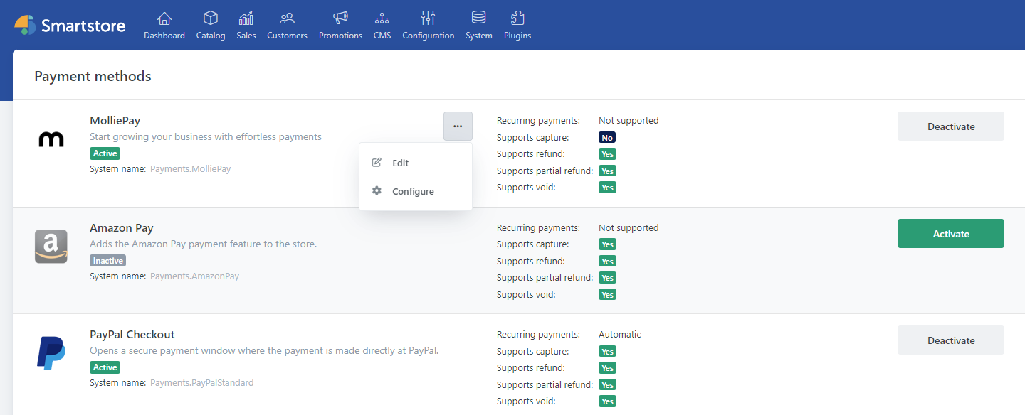 Gleichzeitig bietet dieser Schritt die Möglichkeit, die jeweils gebuchten Zahlungsoptionen im Smartstore-Backend zu aktivieren.