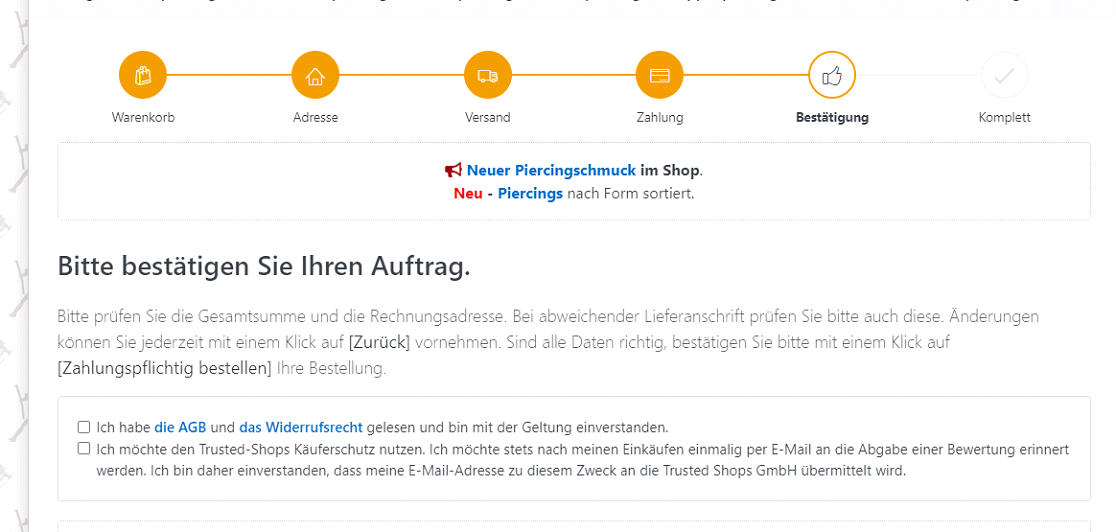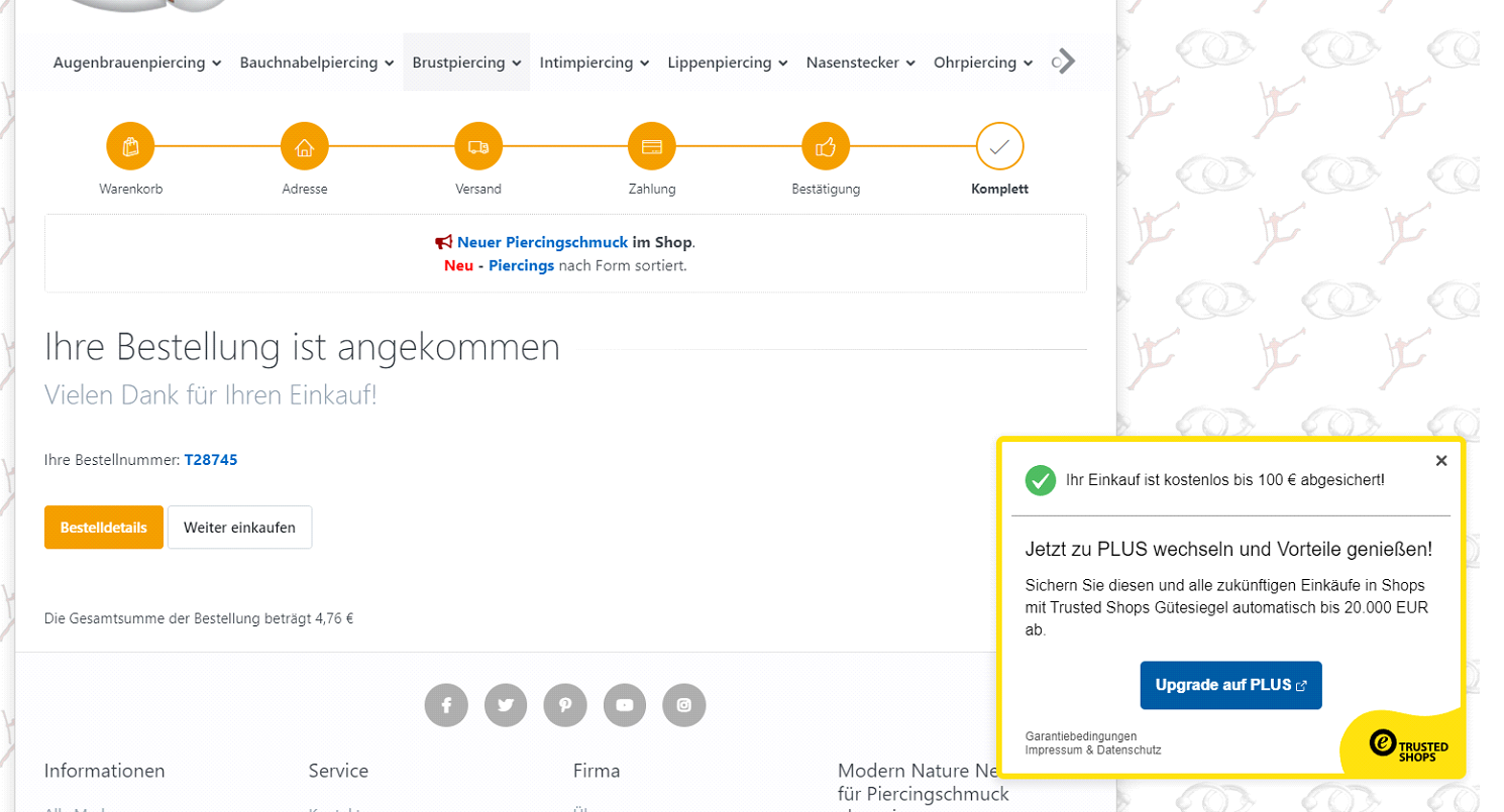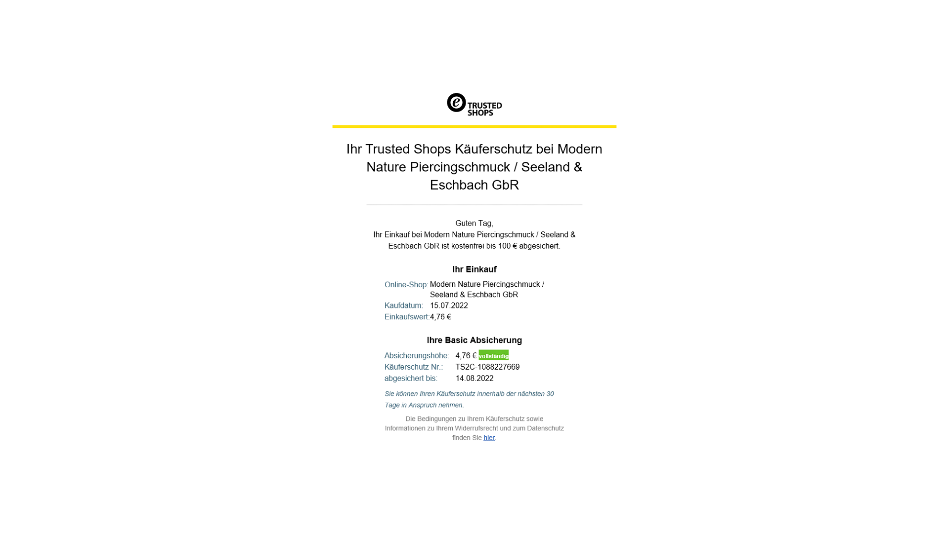 Nach der Kaufbestätigung wird dem Kunden der gewährte Trusted Shops Käuferschutz angezeigt. Die Höhe des Käuferschutz richtet sich nach dem mit Trusted Shops vereinbarten Bedingungen. Optional kann der Kunde den Käuferschutz kostenpflichtig erhöhen. Mit dem Abschluss der Bestellung erhält der Kunde eine Bestätigungsmail von Trusted Shops.