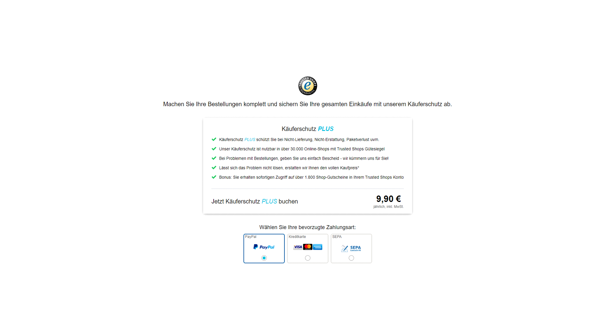 Mit dem Trusted Shops Käuferschutz vermindern Kunden ihr Risiko beim Onlinekauf, da Trusted Shops eine Garantie für die Sicherheit des Kaufpreises übernimmt. Dies tritt beispielsweise bei Fällen auf, in welchen die Bestellung den Kunden nicht erreicht, ein erworbener Gutschein nicht funktioniert oder eine Versicherungsleistung nicht genutzt werden kann. Wenn das finanzielle Risiko für den Verbraucher möglich gering ist, können Sie als Shopbetreiber so Warenkorbabrüchen vorbeugen und mehr Aufträge erfolgreich abschließen.