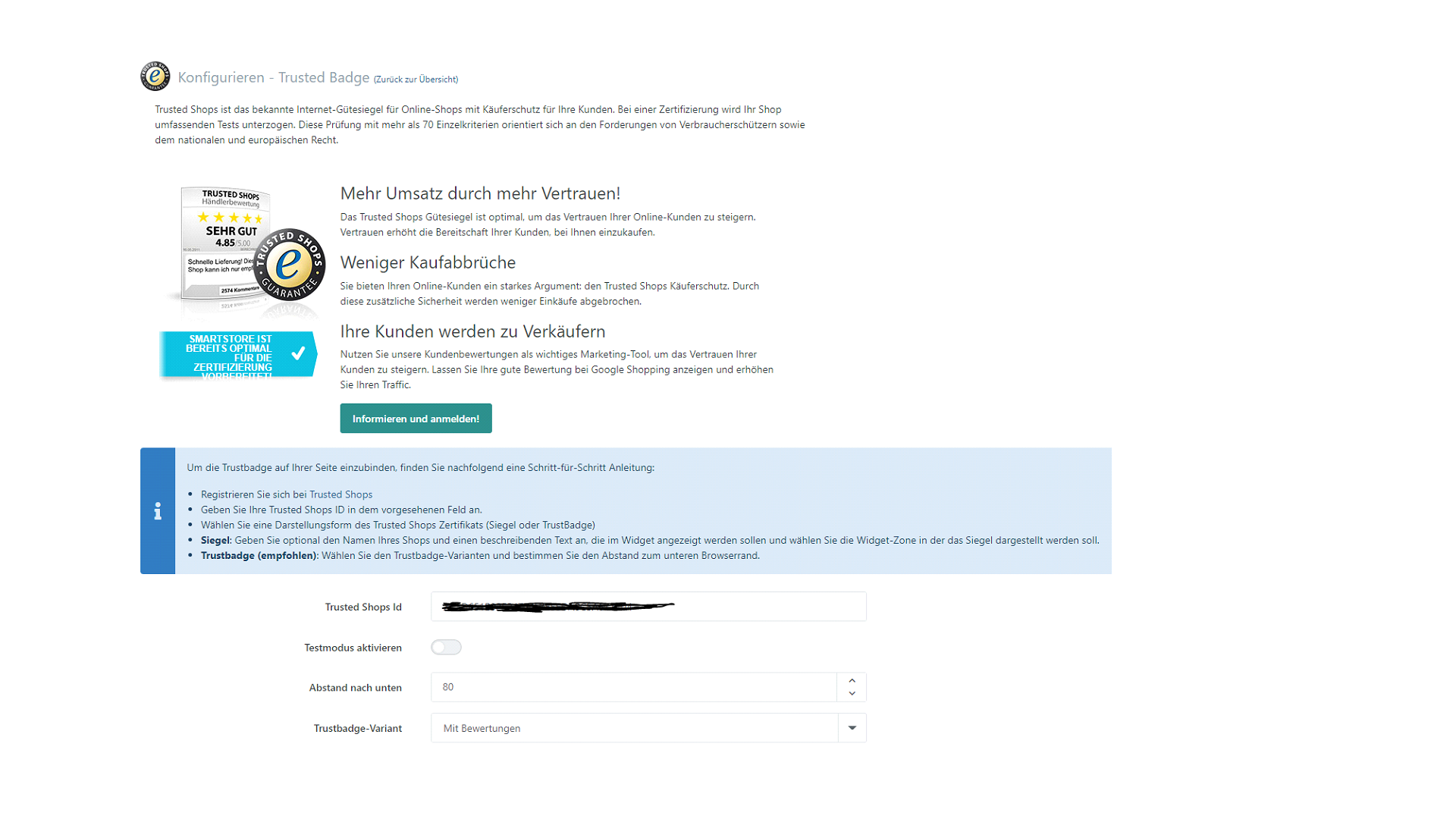 Das Trusted Shops Gütesiegel zeigt dem Verbraucher, dass Sie die umfangreiche Liste an Qualitätskriterien von Trusted Shops erfüllen. Es signalisiert Ihren Kunden somit eine sichere Einkaufsmöglichkeit, Transparenz und eine gute Erreichbarkeit des Shobbetreibers. Die Darstellung ist entweder über die Trustbadge oder als einfache Grafik möglich. Nach der erfolgreich abgeschlossenen Registrierung bei Trusted Shops erhalten Shopbetreiber ihre jeweilige Trusted Shops ID. Diese benötigen Sie innerhalb des Trusted Shops Widget Plug-ins, um sie in das dafür vorgesehene Feld einzutragen. Somit ist ihr Smartstoreshop mit Trusted Shops verknüpft.