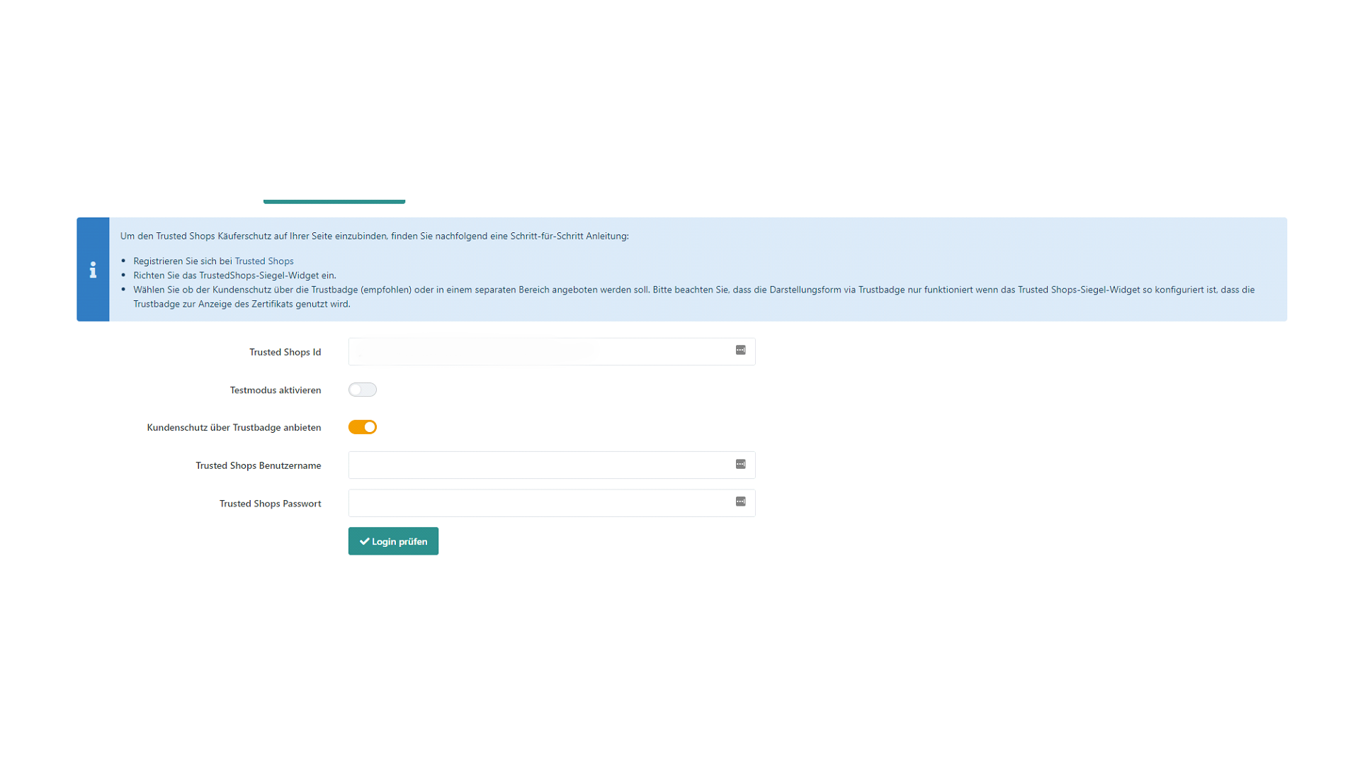 Die Trusted Shops Widgets ermöglichen die Darstellung der Trustbadge, das Erfassen von Kundenbewertungen sowie die Integration des TrustedShops Käuferschutz. Für die Nutzung des Plug-ins ist eine Registrierung bei Trusted Shops notwendig.