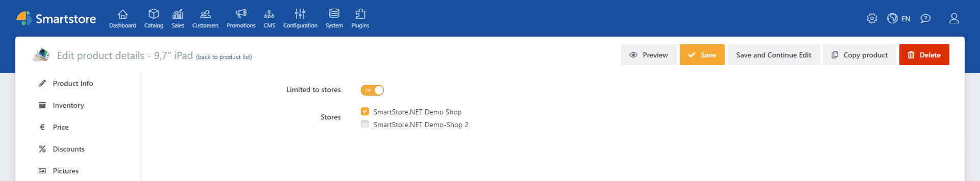 The allocation of products for the individual shops is done directly in the product details.